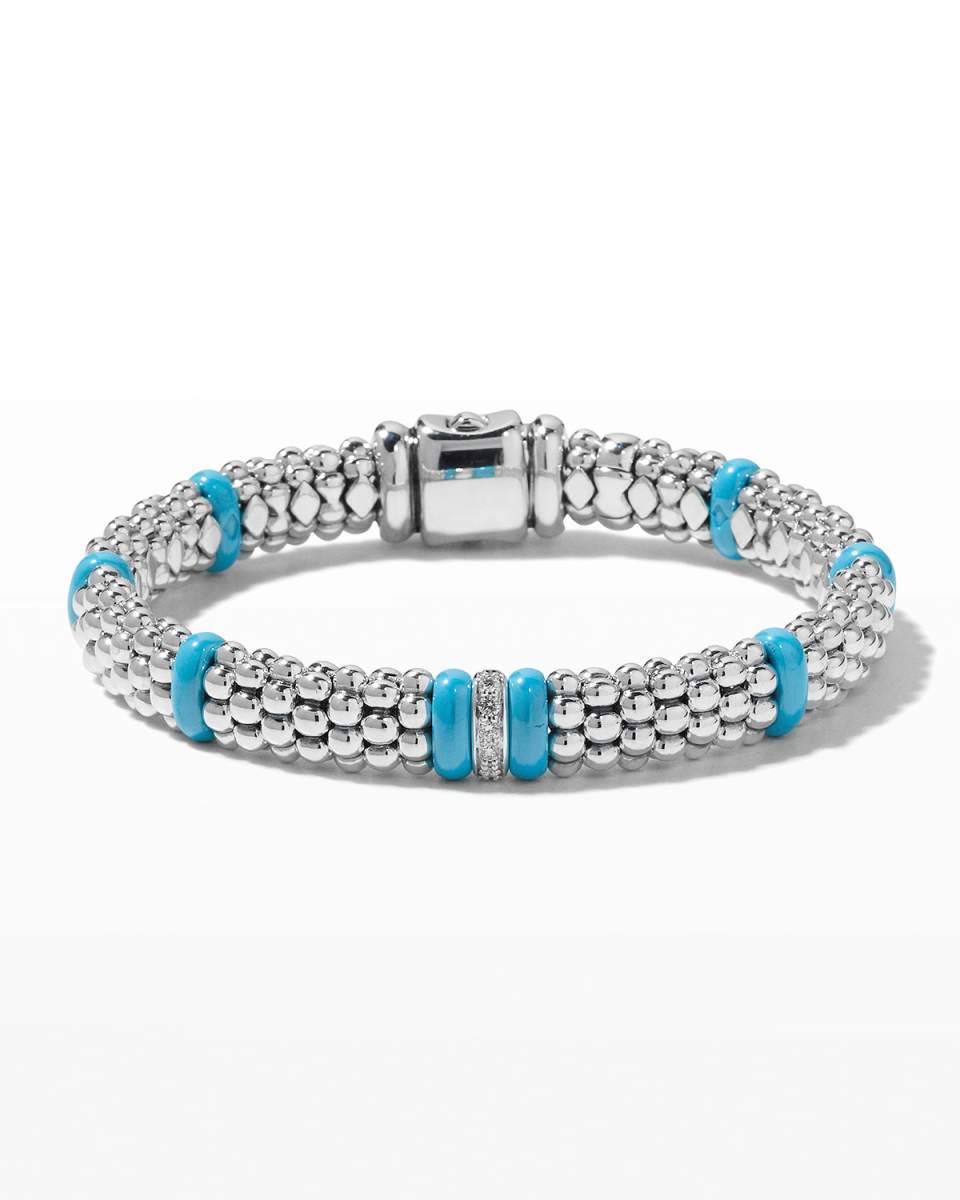 LAGOS bracelet from the Blue Caviar Collection. Polished sterling silver with blue ceramic beads. Caviar beading with one diamond pavé station. 0.11 total diamond carat weight. Approx. 0.4" (9mm) wide. Doublepusher clasp. Imported.