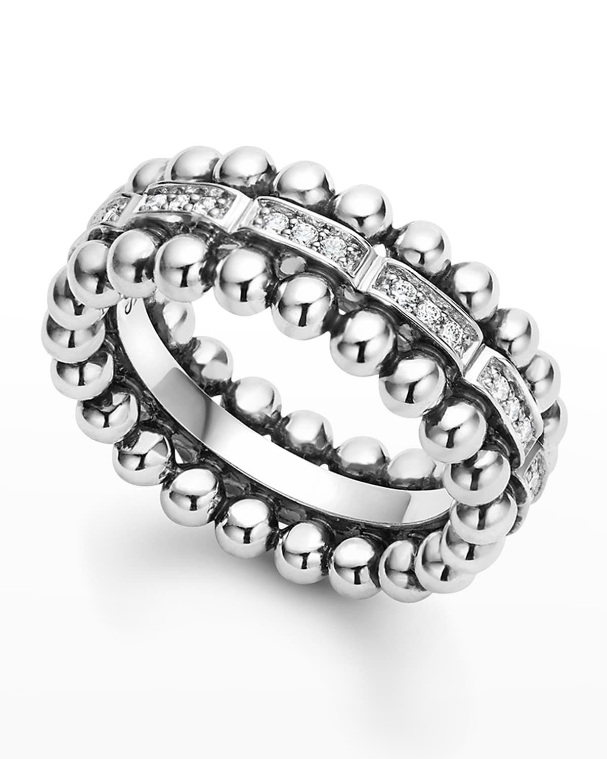 Caviar Spark diamond ring from LAGOS. Polished sterling silver Caviar beading. White diamonds framed at center. 0.26 total diamond carat weight. Approx. 8mm wide.