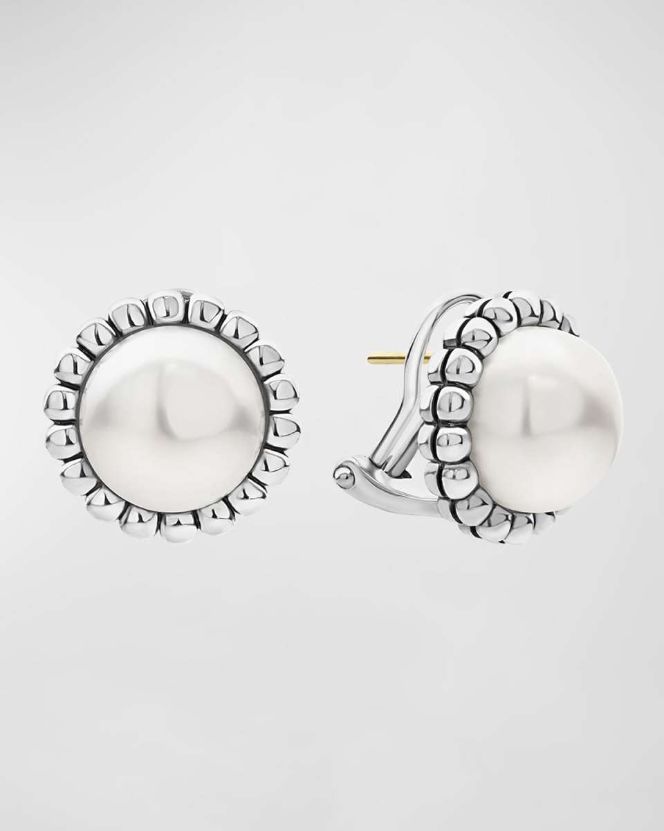 Cultured freshwater pearl, 12mm. Sterling silver fluted bezel. Post backs with omega clip. 3/5" diameter.