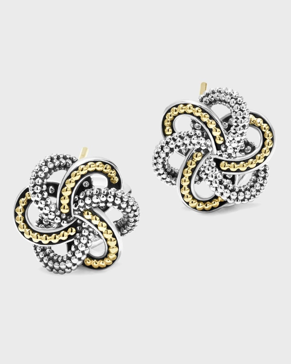 LAGOS earrings from the Love Knot Collection. Sterling silver and 18karat yellow gold. Omega backs for pierced ears. 14karat gold posts. Approx. 0.55"W. Imported.