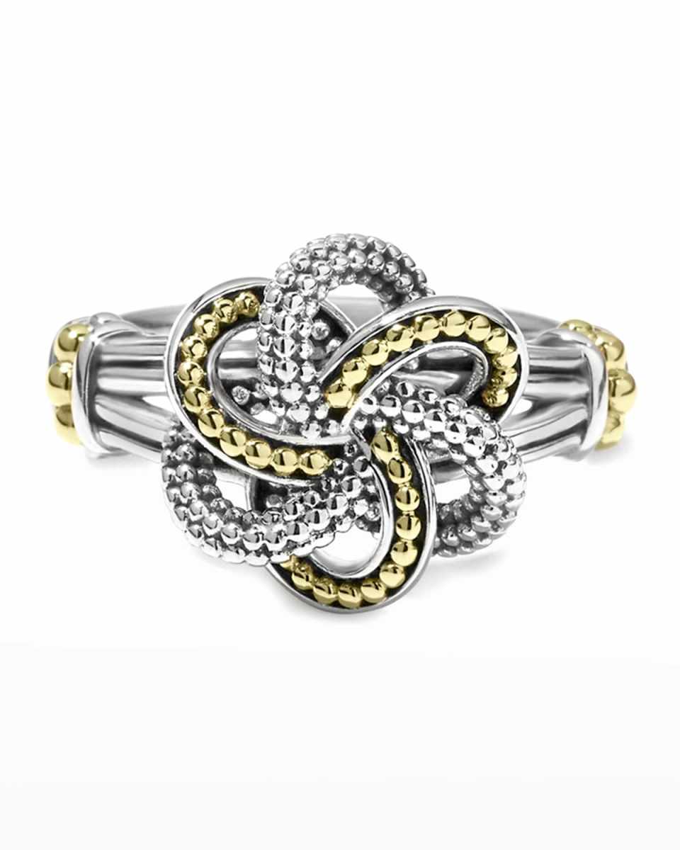 LAGOS ring from the Love Knot Collection. Sterling silver with 18karat yellow gold. 4mm shank tapers to 3mm. Approx. 0.94"L x 0.59"W. Imported.