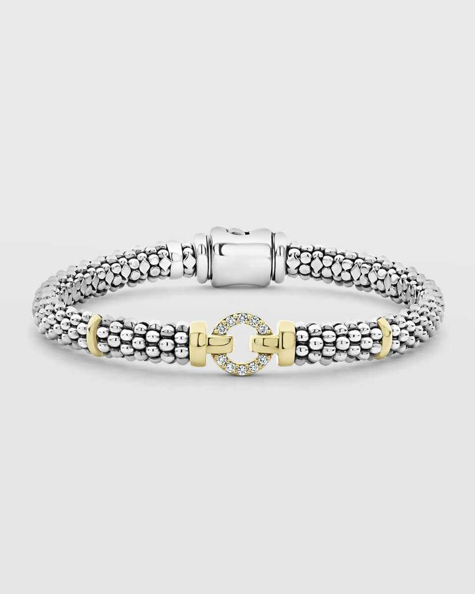 Bracelet by LAGOS. Sterling silver Caviar beads. White pave diamonds set in circle center. 0.12 total diamond carat weight. Approx. 7"L; 6mm wide. Box clasp. Imported.