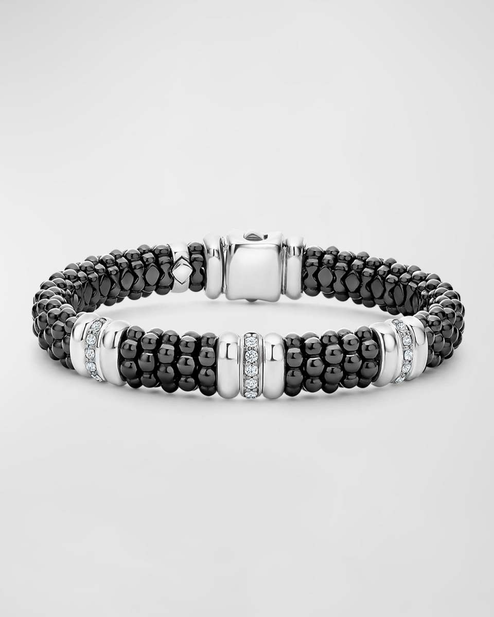 LAGOS bracelet Signature silver caviar beading and smooth black ceramic stations Three diamond pavé stations 0.3 total diamond carat weight Pushlock closure Imported