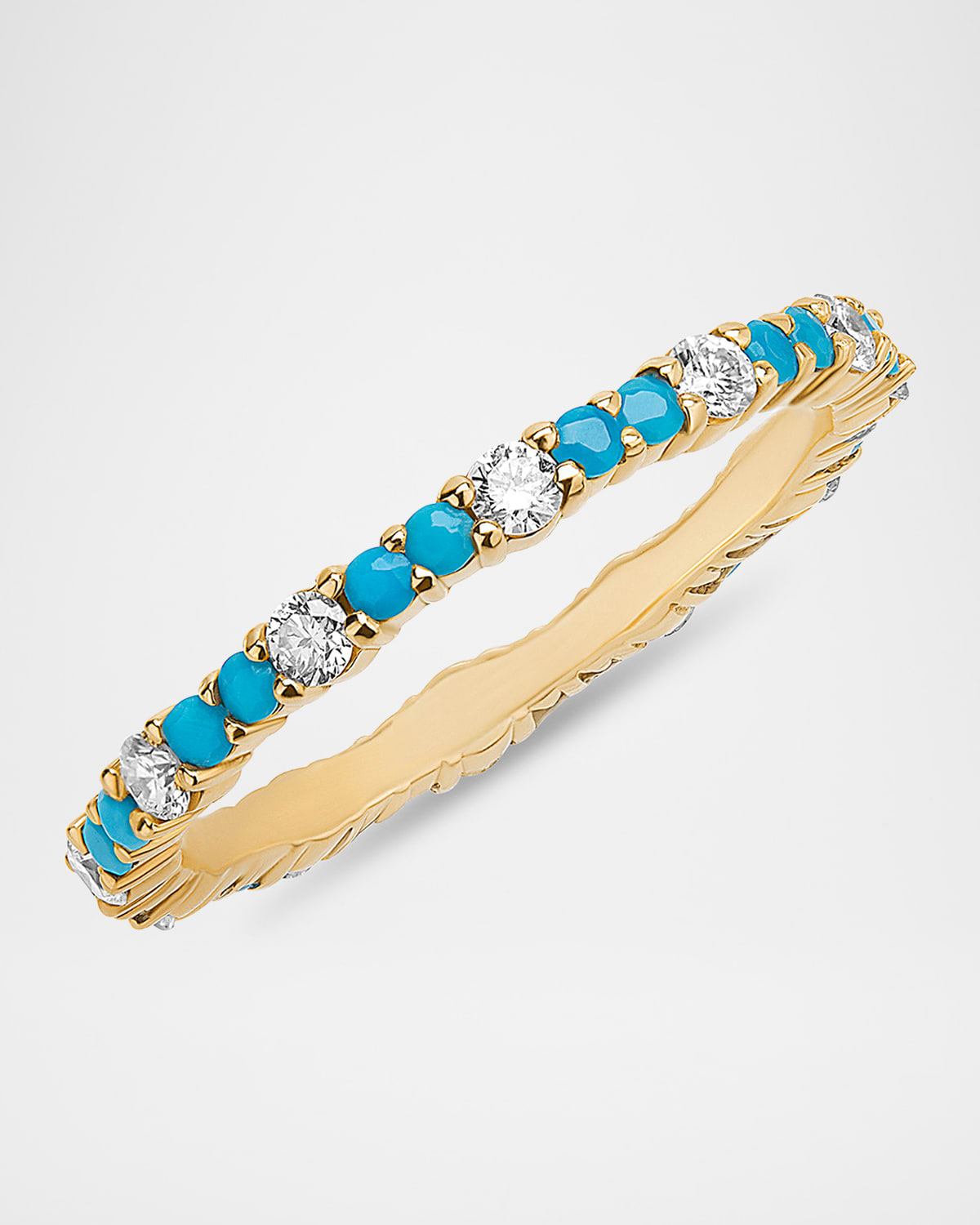 LANA jewelry strikes a fine balance between an elegant and minimalist aesthetic. For example, alternating diamonds and turquoise cabochons detail this eternity ring. Approx. 2mm thick; ring size 6 Polished 14karat yellow gold Total diamond carat weight: 0.7 Imported