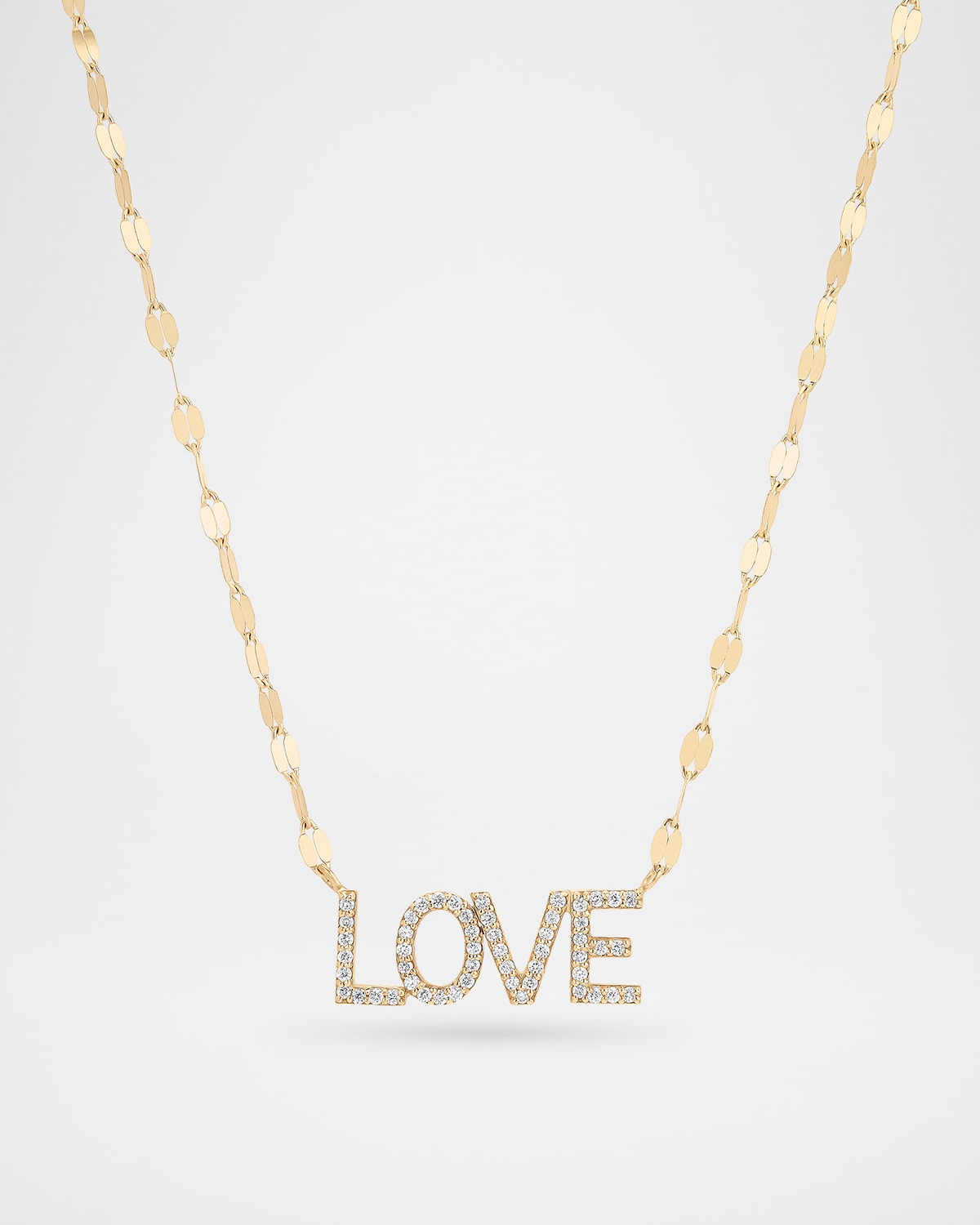 Pavé diamonds paired with LANA's signature flatlink chain highlight a balance of the brand's elegant yet minimalist aesthetic. The brilliant diamonds come together to form this "LOVE" pendant necklace. Approx. 18" length with jump ring at 16"; 6.5mm x 4.5mm initials Polished 14karat yellow gold Total diamond carat weight: 0.14 Adjustable length Lobster clasp Imported