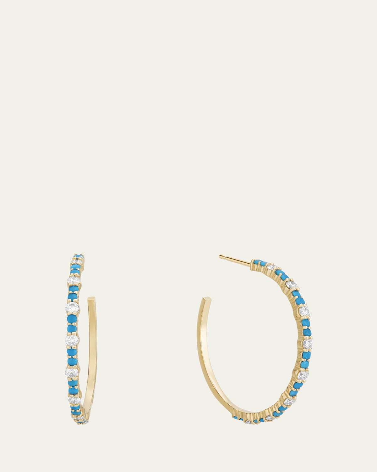 LANA jewelry strikes a fine balance between an elegant and minimalist aesthetic. For example, alternating diamonds and turquoise cabochons detail these hoop earrings. Approx. 30mm drop Polished 14karat yellow gold Total diamond carat weight: 0.99 For pierced ears Post backs Imported