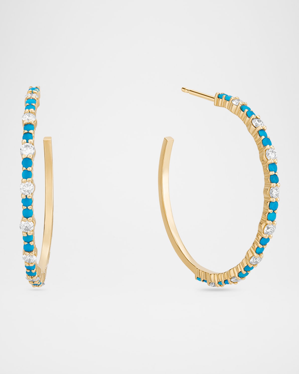LANA jewelry strikes a fine balance between an elegant and minimalist aesthetic. For example, alternating diamonds and turquoise cabochons detail these hoop earrings. Approx. 30mm drop Polished 14karat yellow gold Total diamond carat weight: 0.99 For pierced ears Post backs Imported