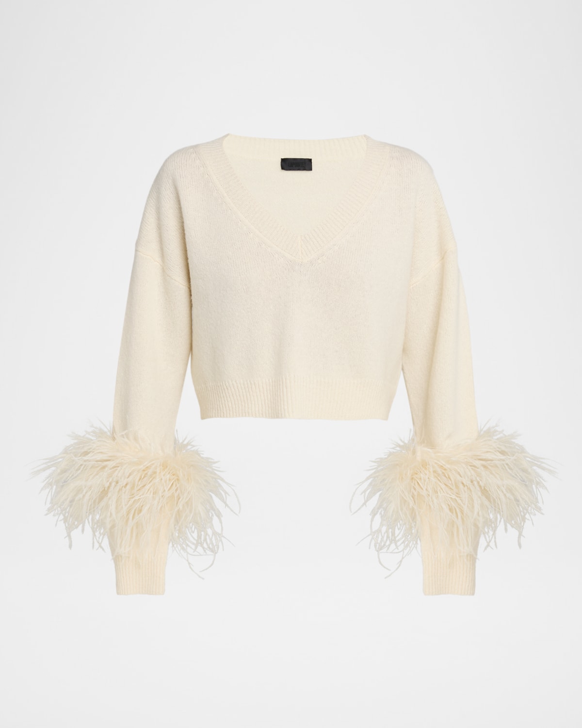 LAPOINTE sweater is crafted from fine soft cashmere with ostrich feathertrimmed sleeves for a fusion of cozy softness and dramatic flair V neckline Long sleeves Drop shoulders Boxy fit Cropped length Ribbed cuffs and hem Pullover style Cashmere/feather Made in Italy