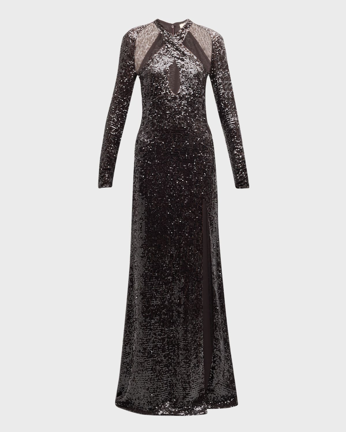 LAPOINTE sequin embellished gown featuring keyhole cutouts, shrug sleeve detail, and a side slit hem Halter neckline Long sleeves Aline silhouette Floor sweeping hem Invisible back zip Viscose Unlined Dry clean Imported