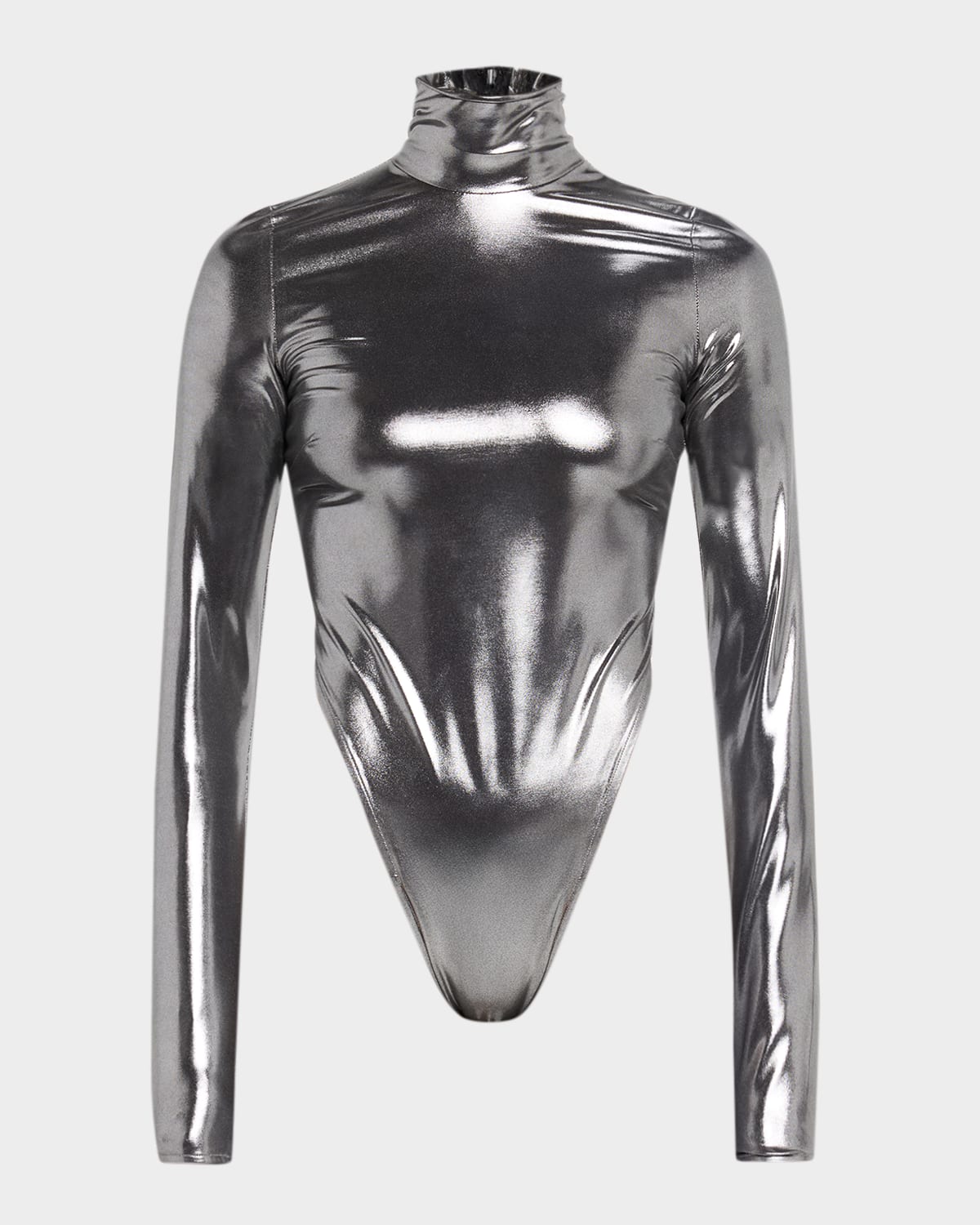 Mock-Neck Shiny Jersey Long-Sleeve Bodysuit