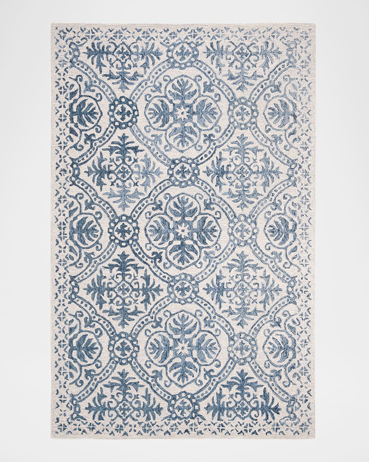 Classic Art Decoinspired motifs create a delicate filigree in soft denim over gentle ivory hues on the Nina Rug. Spacedyed yarns lend a light, natural transition between the patterns, and the microloop weave provides a thick, cushioned feel underfoot. Handcrafted of wool Rug height: 0.5" Item Weight (Lbs.): 25.0 Vacuum regularly; professional clean only Size is approximate; we recommend use of a rug pad (not included) Imported