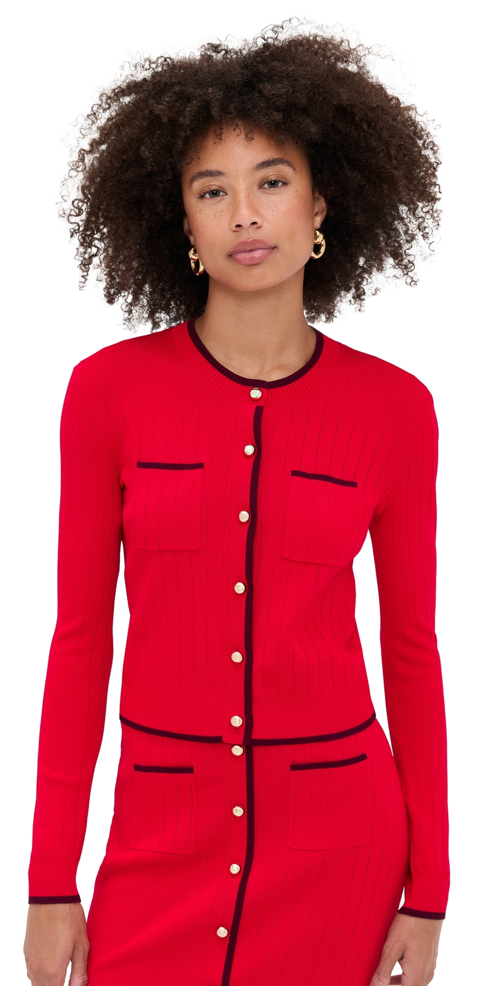 Fabric: Lightweight stretch knit. Gold-tone hardware. Crew neck. Long sleeves. Button placket. Patch breast pocket. Shell: 54% viscose/46% nylon. Wash cold. Imported, China. Measurements: Measurements from size XS Length: 19in / 48.0cm, from shoulder