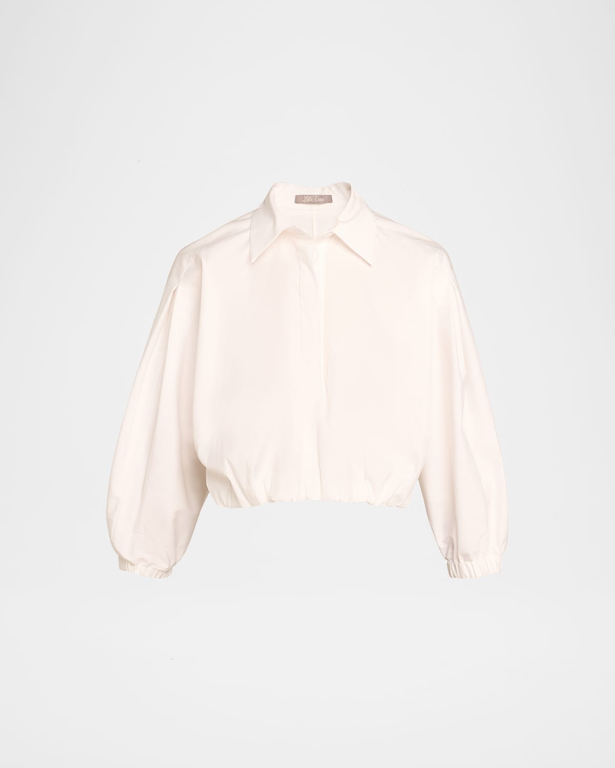 Lela Rose blouse with elastic cuffs and hem Spread collar; concealed button placket Threequarter sleeves Relaxed fit Cropped length Cotton/elastane Made in USA from imported materials