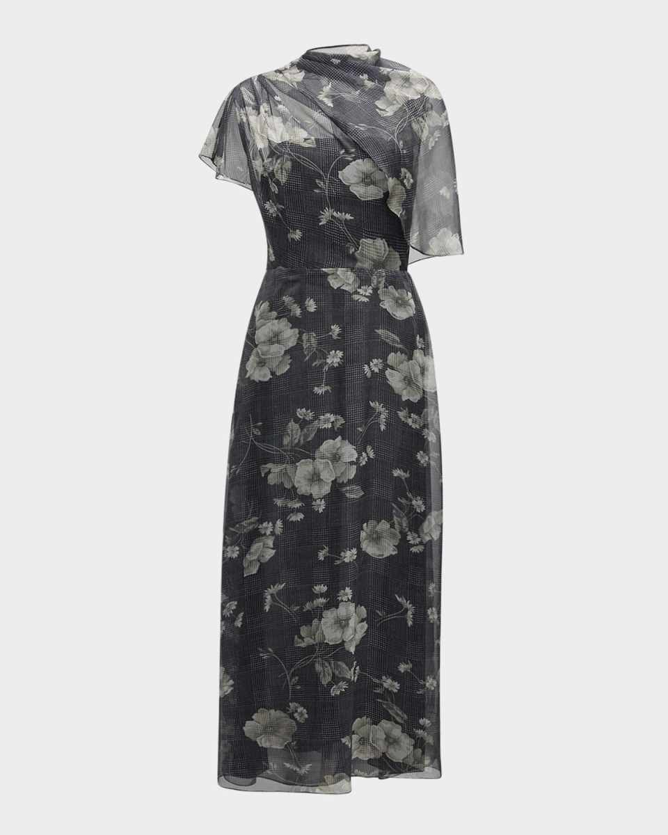 Lela Rose chiffon dress featuring a floral check print and a draped bodice with a half cape Mock neckline Short sleeves Tea length Aline silhouette Invisible back zip Polyester Lining: Polyester Dry clean Made in USA
