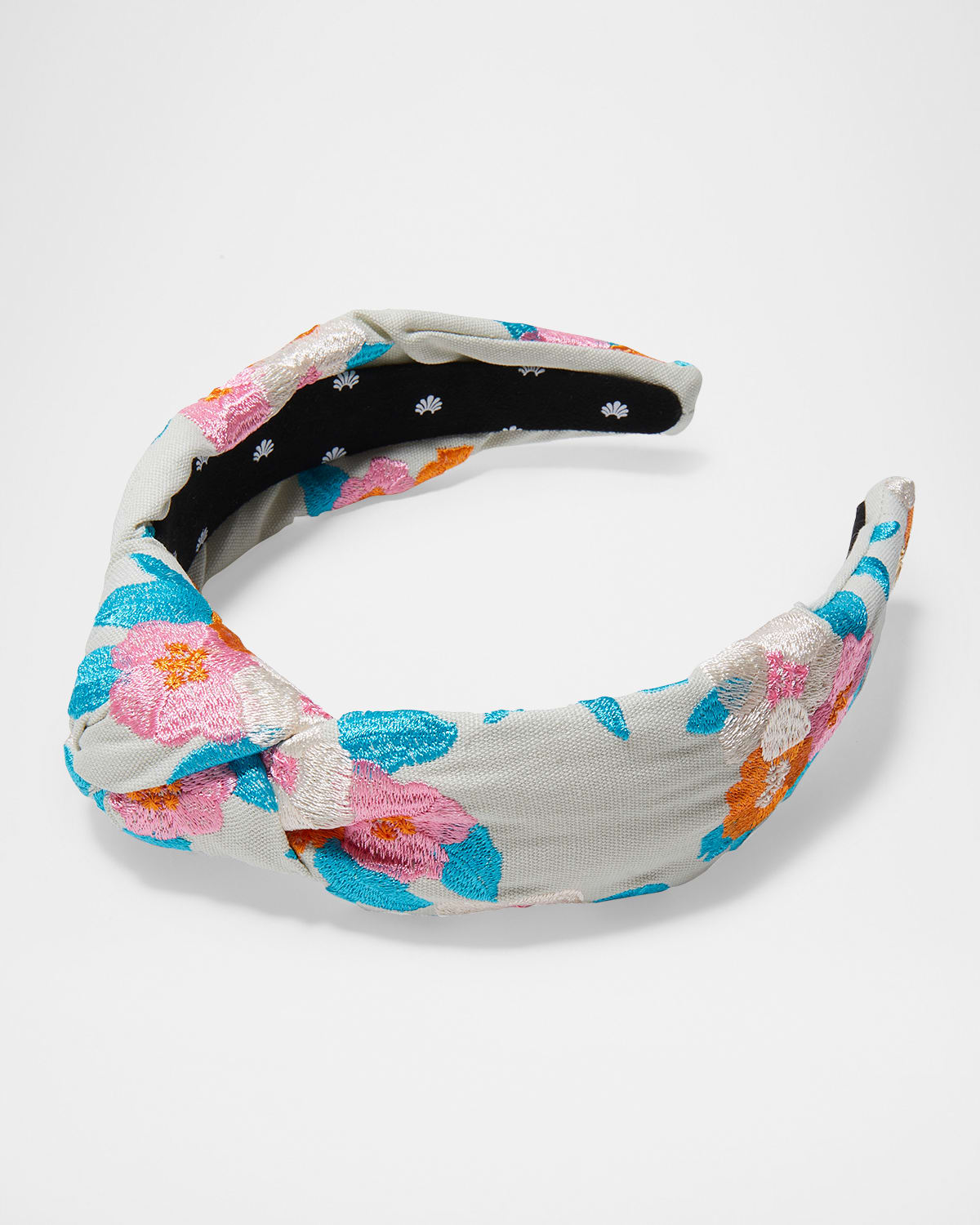 Lele Sadoughi headband embroidered with a multicolor floral motif Knotted top Trademark logo charm One size fits most Spot clean, store in custom striped pouch Cotton Imported