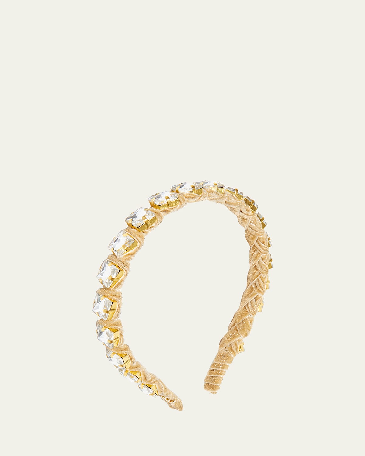 Lele Sadoughi headband in golden polyester velvet handembellished with a row of glass crystals with 14karat gold plated prong settings Trademark logo charm Spot clean Imported