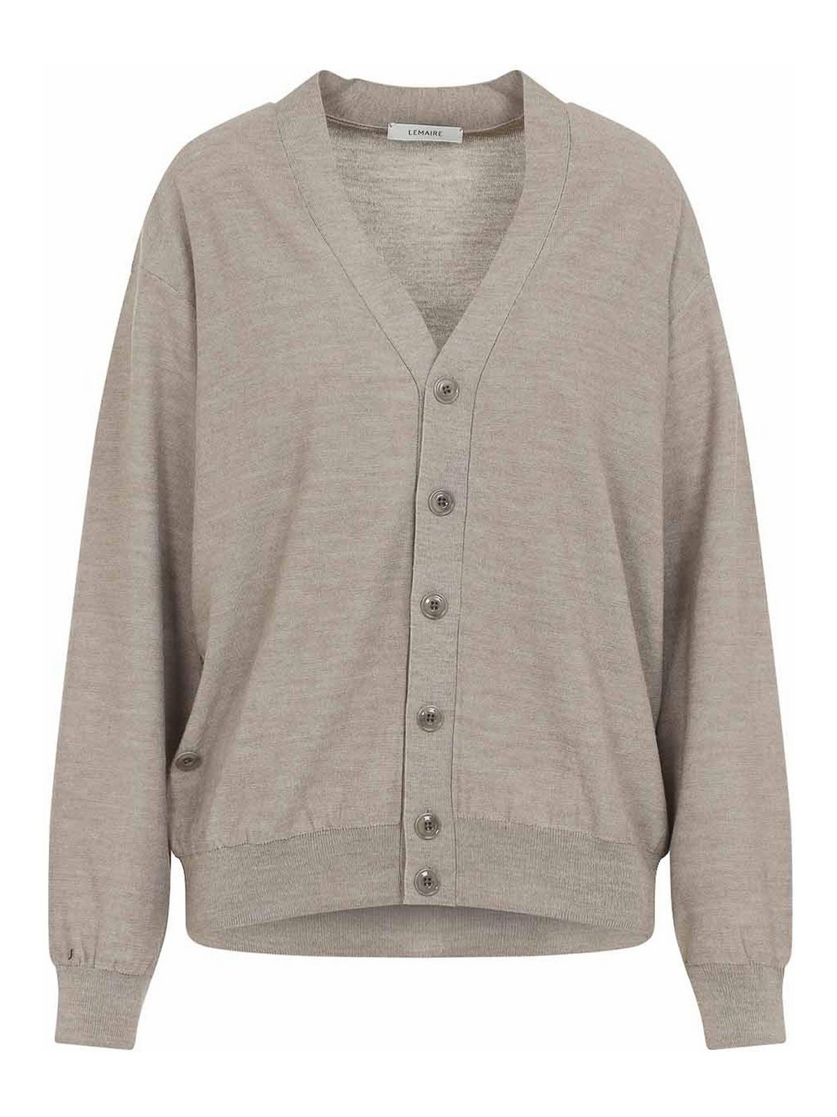 Cardigan torsadé décontracté Lemaire taupe clair confectionné en V, col boutonné, épaules tombantes, manches longues, poignets et ourlet côtelés, ourlet droit