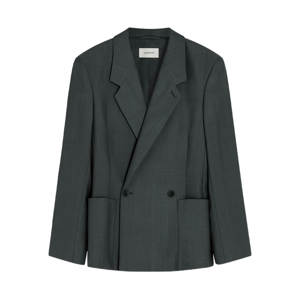 coal double-breasted closure tailored collar structured shoulders patch side pockets long sleeves