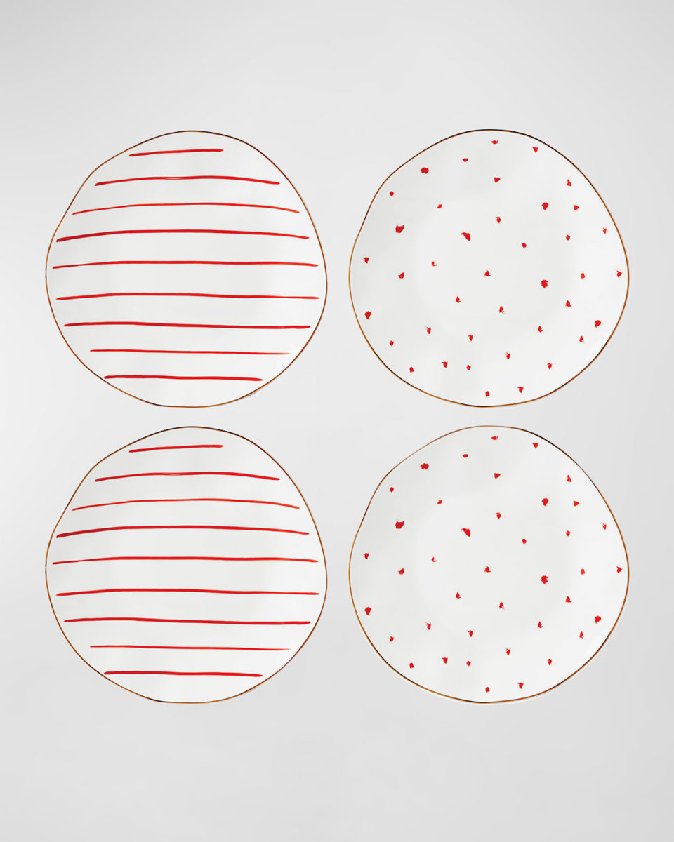 Serve anything from apple pie to coffee cake to cookies with garnet bay dinner plates. Featuring sweet and simple dots and stripes with gold banding, these plates are perfect for delicious afterdinner sweets, or for enjoying your morning meal. Crafted of porcelain Approx. 8"Dia. Item weight, 4.2 lbs Set of four Microwave and dishwasher safe Imported Boxed weight, approximately 6.0 lbs.