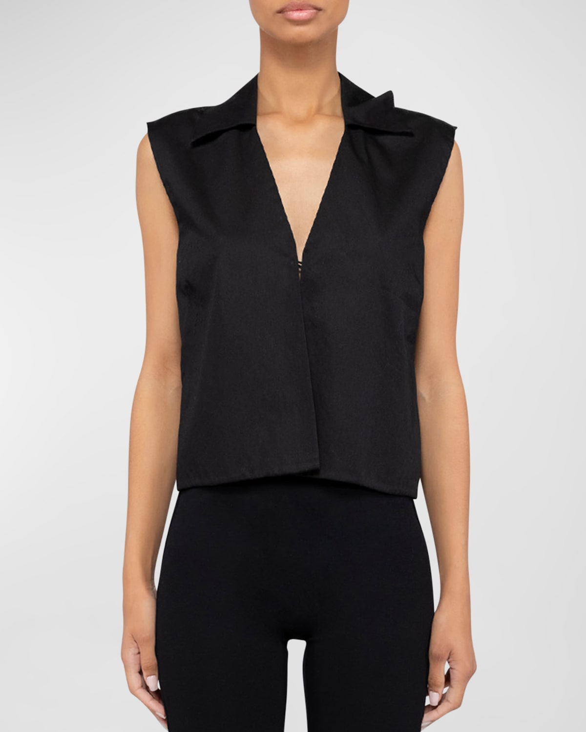 LESET "Yoko" solid vest Approx. 21.3"L from shoulder to hem Collared V neckline; buttonandloop closure Sleeveless Hip length Relaxed fit Cotton Unlined Machine wash cold, tumble dry Made in USA
