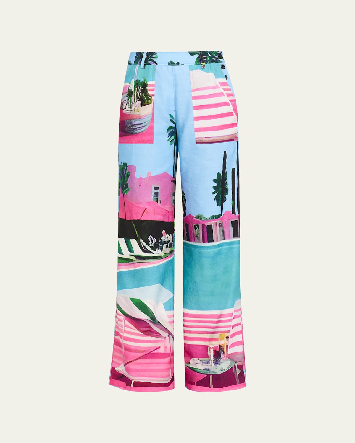 Libertine "Poolside" pants featuring a graphic print and button side detail Approx. 32" inseam Mid rise sits high on hip Angled side slip pockets; back welt pockets Straight legs Full length Button side closure; belt loops Cotton/linen Dry clean Made in USA