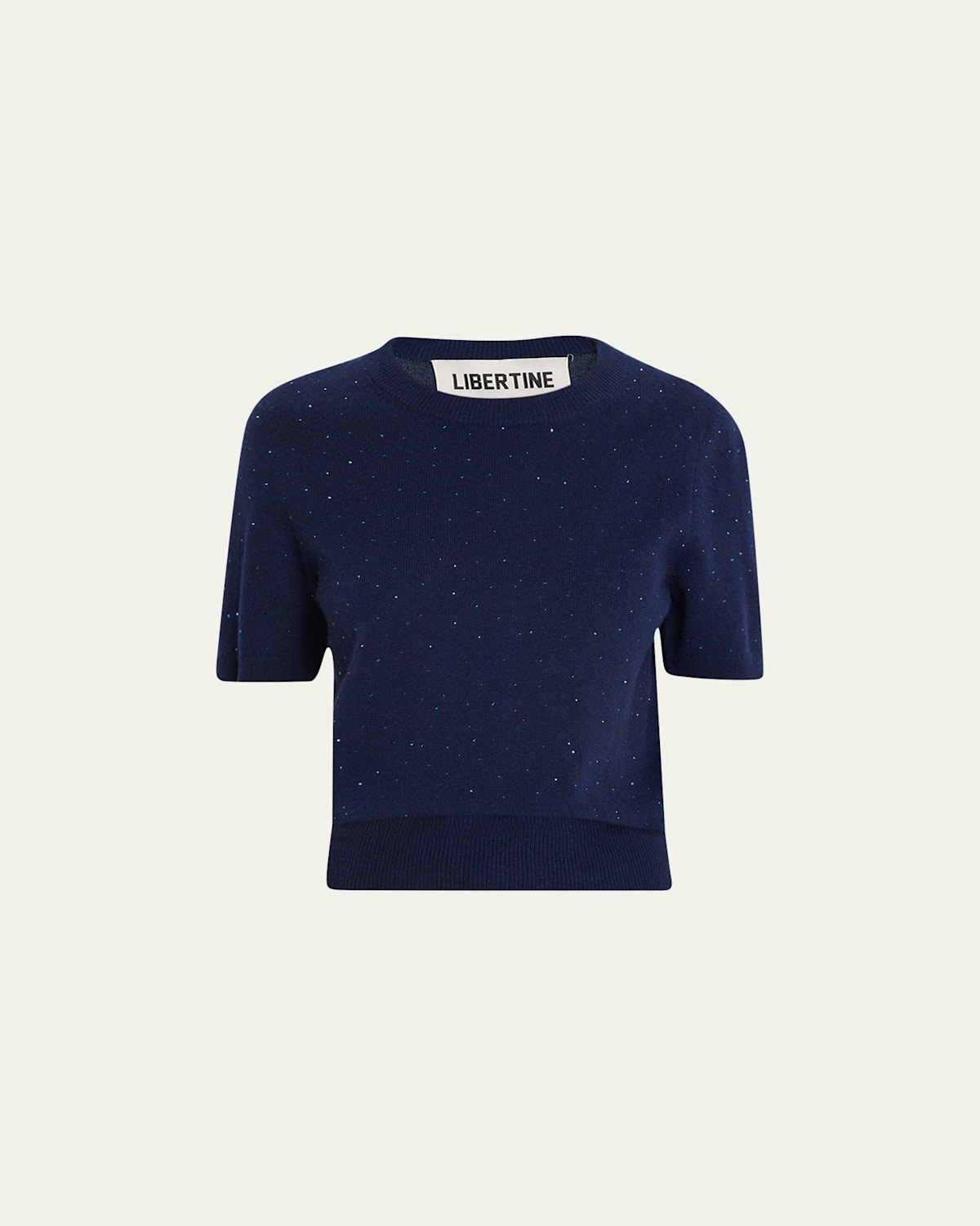 Libertine "Stardust" knit sweater features rhinestone embellished details throughout Approx. 22" from shoulder to hem Crew neckline Short sleeves Ribbed trim Hip length Pullover style Relaxed fit Cashmere Made in USA
