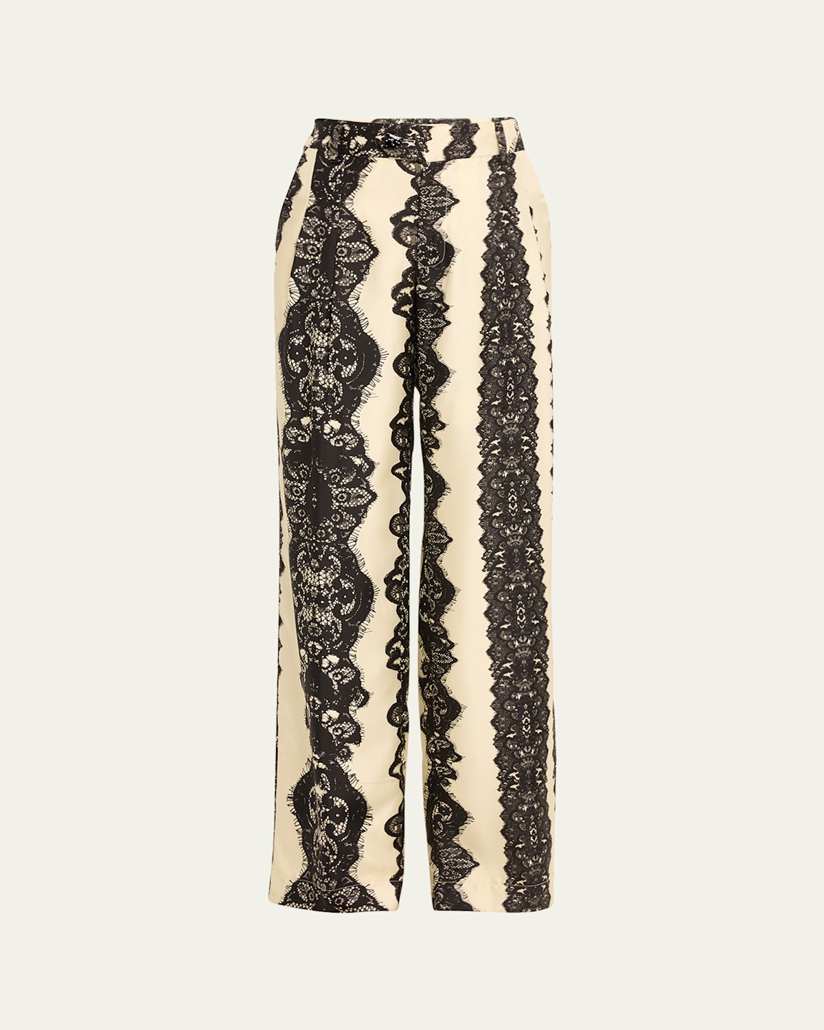 Libertine baggy straightleg trousers with Venetian lace details throughout Approx. 34" inseam Midrise; sits high on the hip Buttonzip fly; belt loops Side slip pockets; back welt pockets Full length Relaxed fit Silk Dry clean Made in USA