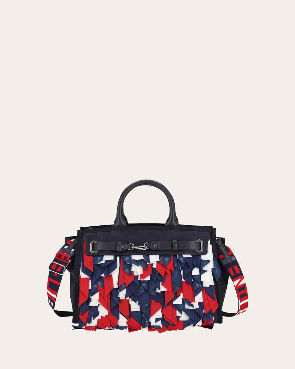 Libertine x LeSportSac "Johnny Go Lightly" top handle bag in logo fringe polyester Top handles with flap pouch Detachable, adjustable shoulder strap Can be worn as a top handle or shoulder bag Zip top closure; front lobster clasp Interior, one slip pocket Feet protect bottom of bag Approx. 10.4"H x 13.8"W x 7"D Imported