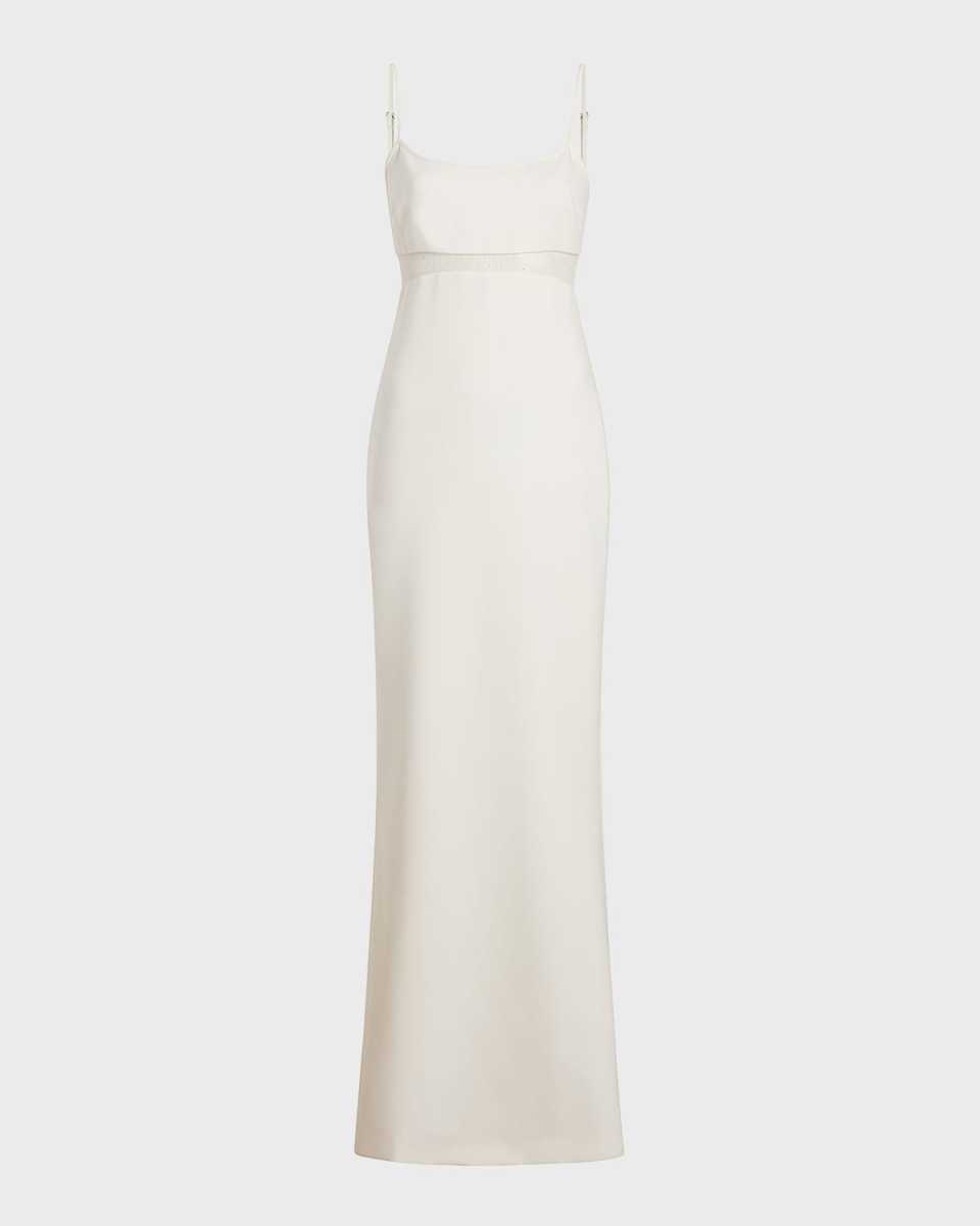 Likely "Stefania" bridal gown complete with point d'esprit panels Approx. 56.75"L from shoulder to hem Scoop neckline Adjustable straps Column silhouette Floorlength hem Concealed back zipper Polyester/rayon/spandex Dry clean only Imported