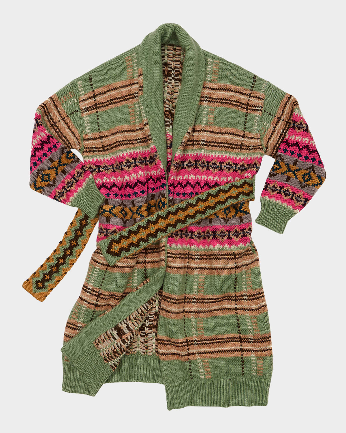 Lingua Franca "Bianca" robe in alpaca and sheep wool features a plaid and fair isle jacquard knit Shawl collar; wrap front Drop shoulders Long sleeves Waist selftie Onseam pockets Hem falls below the knee Relaxed fit Animal hair/wool/nylon/polyamide Dry clean Made in Peru