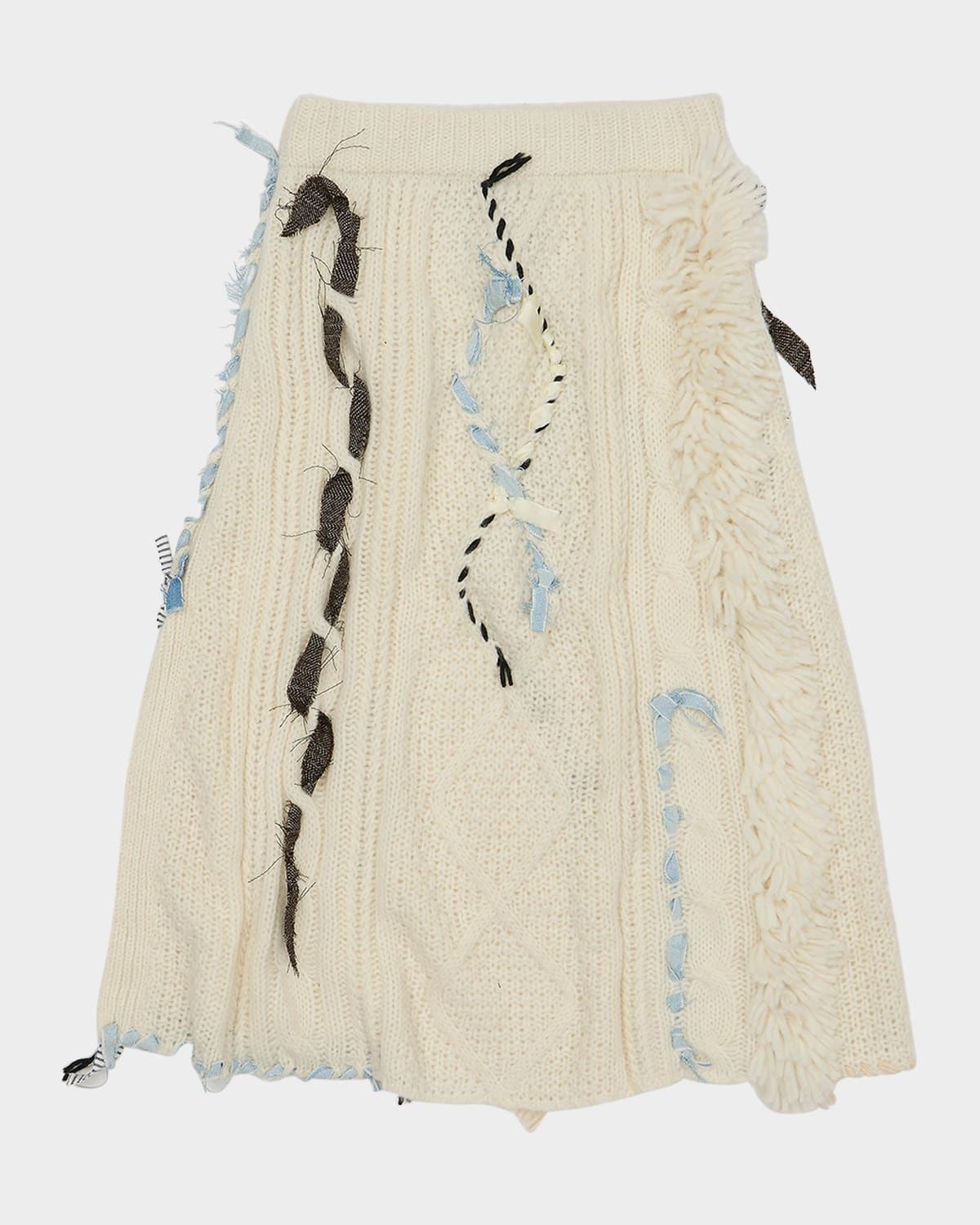 Lingua Franca "Jade" cableknit midi skirt in a soft alpaca blend with fringe trim Features braided fabric and recycled vintage denim embellishments Ribbed waistband Hem falls below the knee Aline silhouette Buttondown side Animal hair/nylon/polyamide/wool Unlined Dry clean Made in Peru
