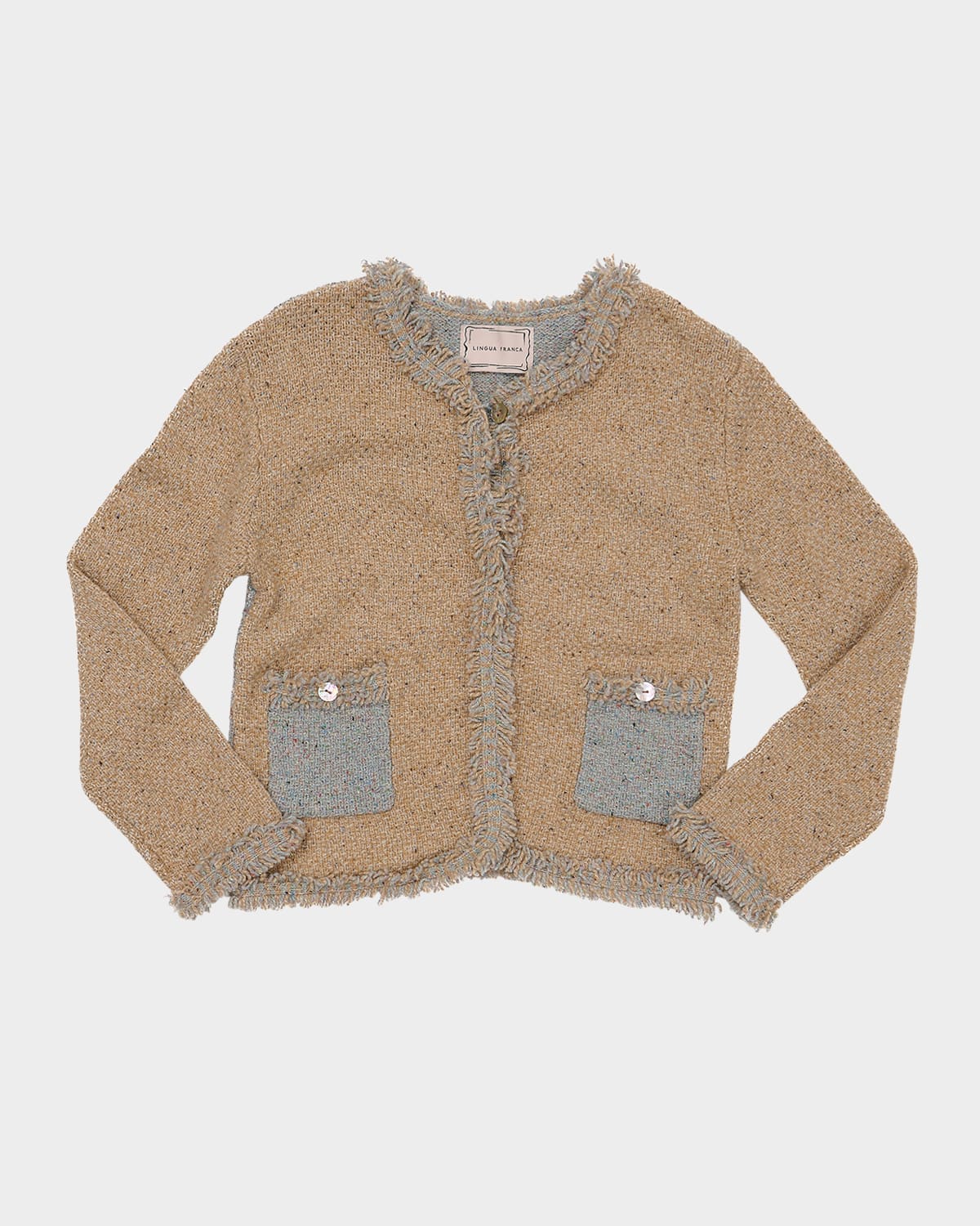 Lingua Franca "Onassis" tweed knit jacket with colorblocking and fringe trim Features shell buttons STANDARD 100 by OEKOTEX® - This item has been laboratory tested to meet 100 control parameters and is free of harmful substances Crew neckline; button front Long sleeves Front patch pockets Relaxed fit Merino wool/nylon/polyamide Unlined Dry clean Imported