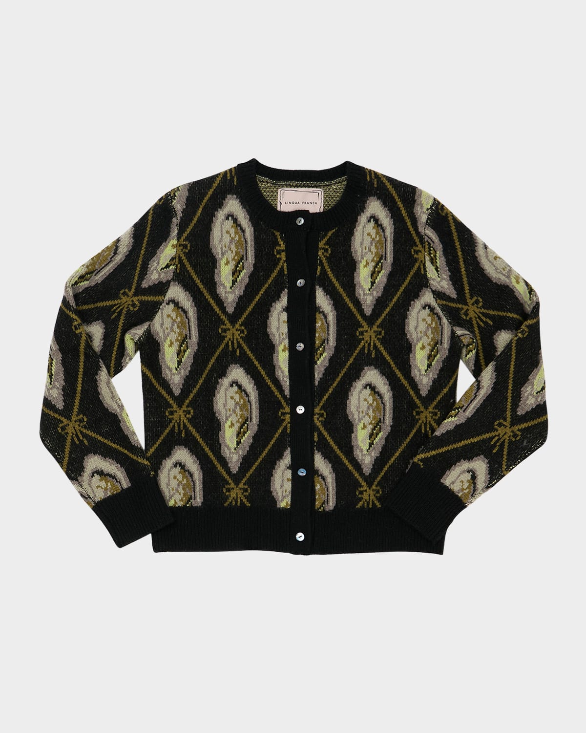 Lingua Franca brushed double jacquard cardigan features an oyster and bow argyle pattern Motherofpearl buttons STANDARD 100 by OEKOTEX® - This item has been laboratory tested to meet 100 control parameters and is free of harmful substances Crew neckline; button front Long sleeves Relaxed fit Merino wool Unlined Dry clean Imported