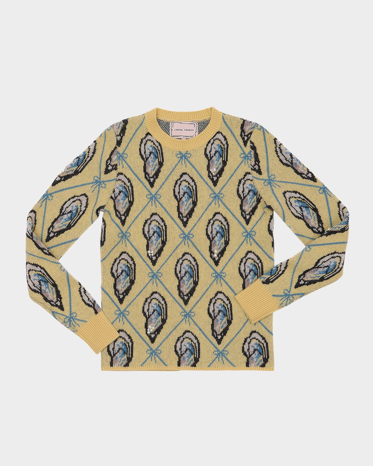 Lingua Franca brushed double jacquard sweater features an oyster and bow argyle pattern Embellished with faux pearls STANDARD 100 by OEKOTEX® - This item has been laboratory tested to meet 100 control parameters and is free of harmful substances Crew neckline Long sleeves Relaxed fit Pullover style Merino wool Unlined Dry clean Imported
