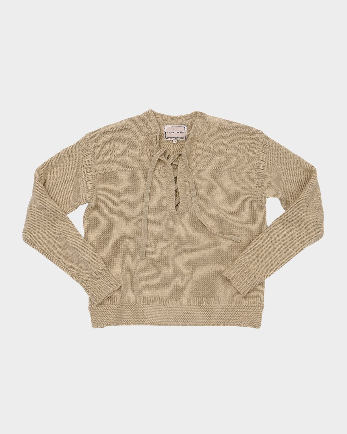Lingua Franca Guernsey pullover features "The End" graphic knit on the yokes STANDARD 100 by OEKOTEX® - This item has been laboratory tested to meet 100 control parameters and is free of harmful substances V neckline; laceup front Long sleeves Relaxed fit Pullover style Merino wool Unlined Hand wash or dry clean Trim: Lace Imported