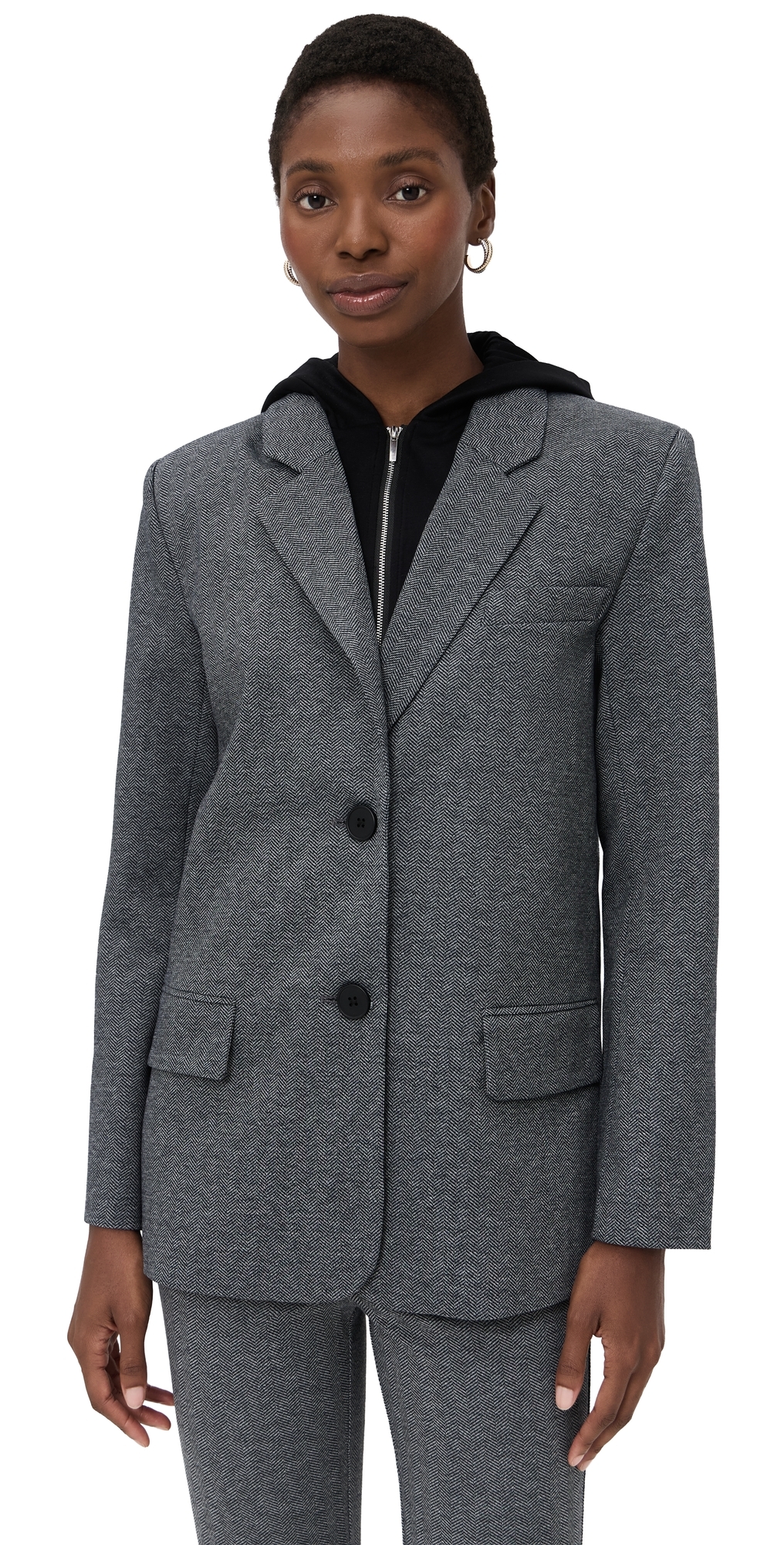 Fabric: Mid-weight, non-stretch herringbone suiting. Hooded jersey neckline with zip placket at interior. Padded shoulders. Collared neck. Long sleeves. Single-breasted button placket. Faux front pockets. Shell: 70% polyester/25% viscose/5% elastane. Lined. Wash cold. Imported, China. Measurements: Measurements from size XS Length: 27.5in / 70.0cm, from shoulder