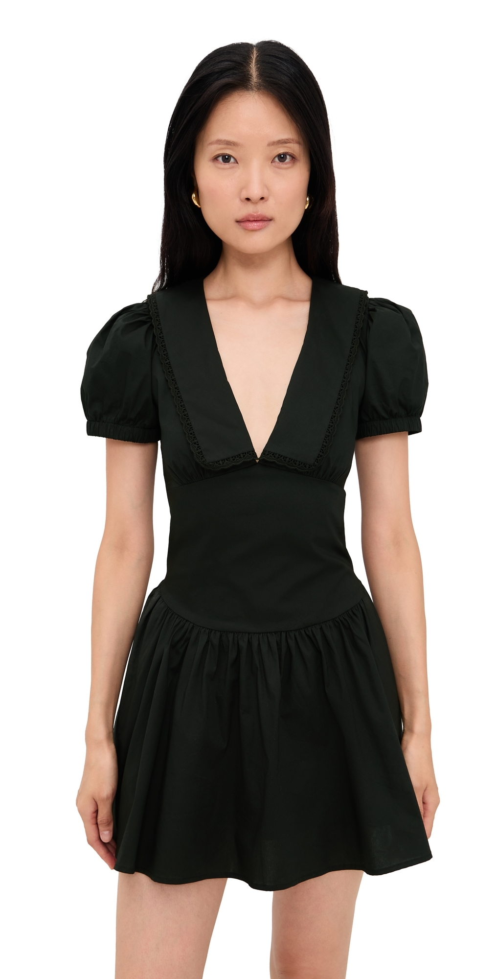 Fabric: Lightweight stretch weave. Lace trim. Fitted waist and ruffled hem. Mini length. V neck. Short puff sleeves with elastic cuffs. Hidden zip at side. On-seam side pockets. Shell: 97% cotton/3% elastane. Lined. Lining: 97% cotton/3% elastane. Hand wash. Imported, China. Measurements: Measurements from size S Length: 31.5in / 80.0cm, from shoulder