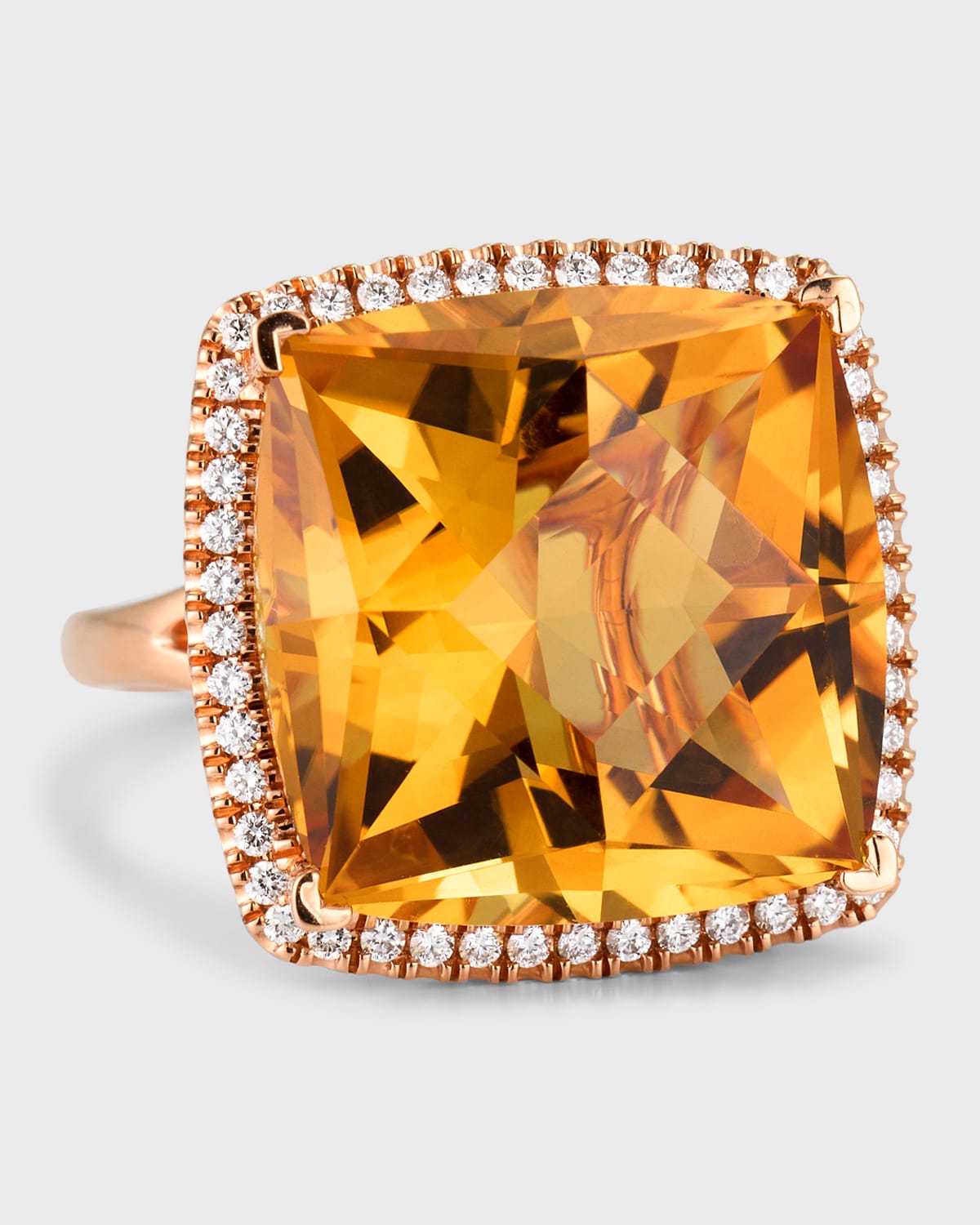 Lisa Nik cocktail ring from the Rocks Collection 18karat solid rose gold Signature 17mm cushioncut citrine gemstone, 0.25 total carat weight 48 round white diamonds, 0.35 total carat weight Approx. ring size 6 Other sizes can be special ordered Imported