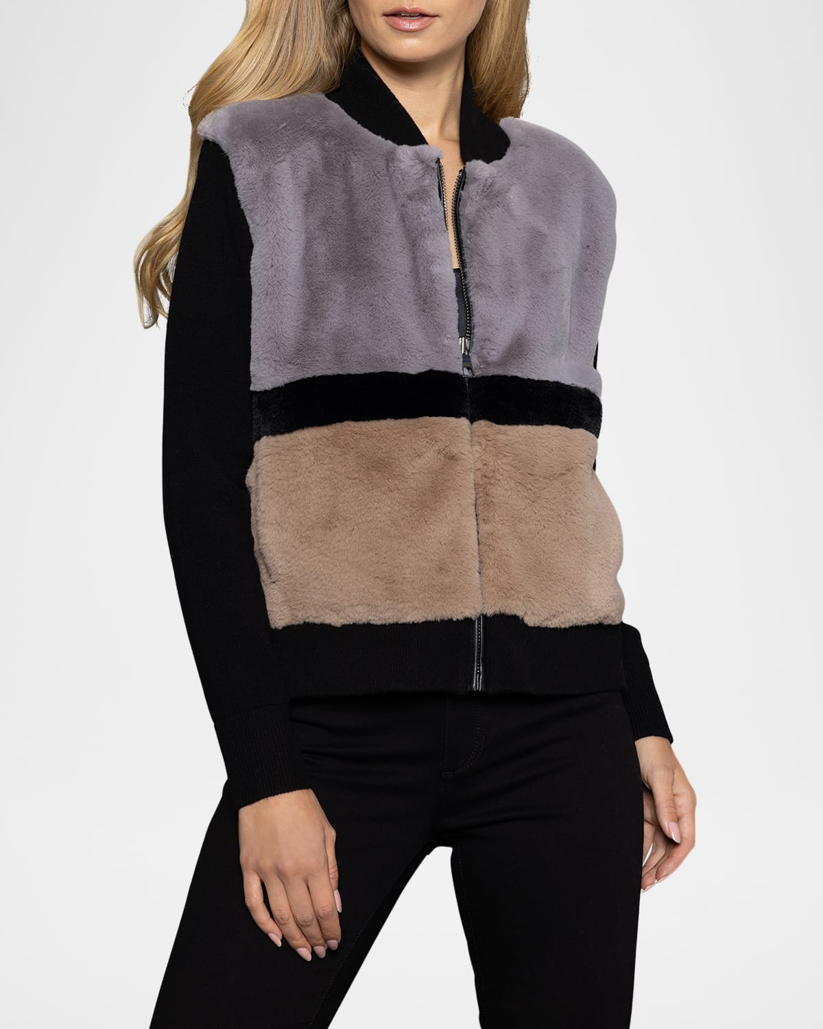 Lisa Todd "Triple Threat" jacket with colorblock faux fur (polyester) front Approx. 23"L from shoulders to hem Baseball collar; zip front Long sleeves Relaxed fit Merino wool Dry clean Trim: Faux fur Imported