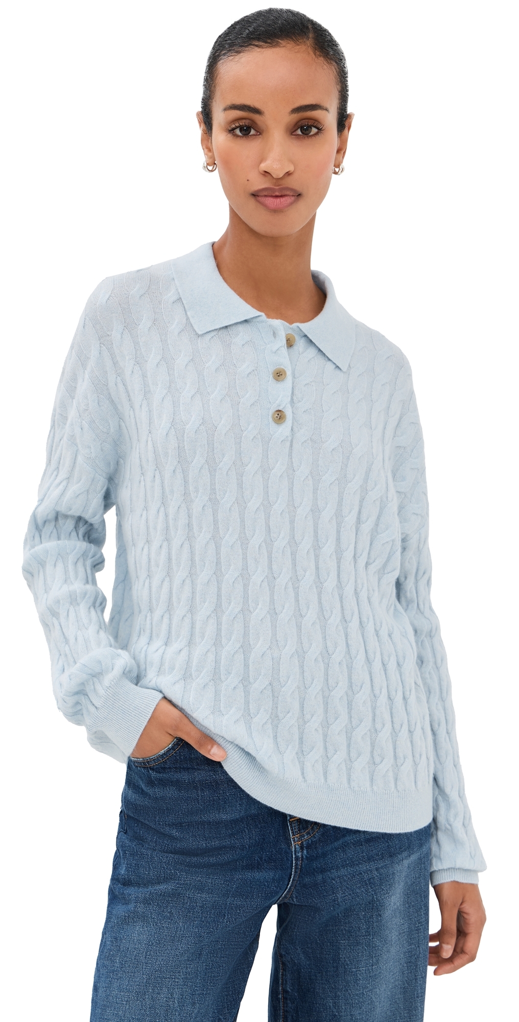 Fabric: Lightweight cable knit with stretch. Ribbed trim. Collared neck. Long sleeves. Partial button placket. Shell: 100% cashmere. Hand wash. Imported, China. Measurements: Measurements from size 0 Length: 20.75in / 53.0cm, from shoulder