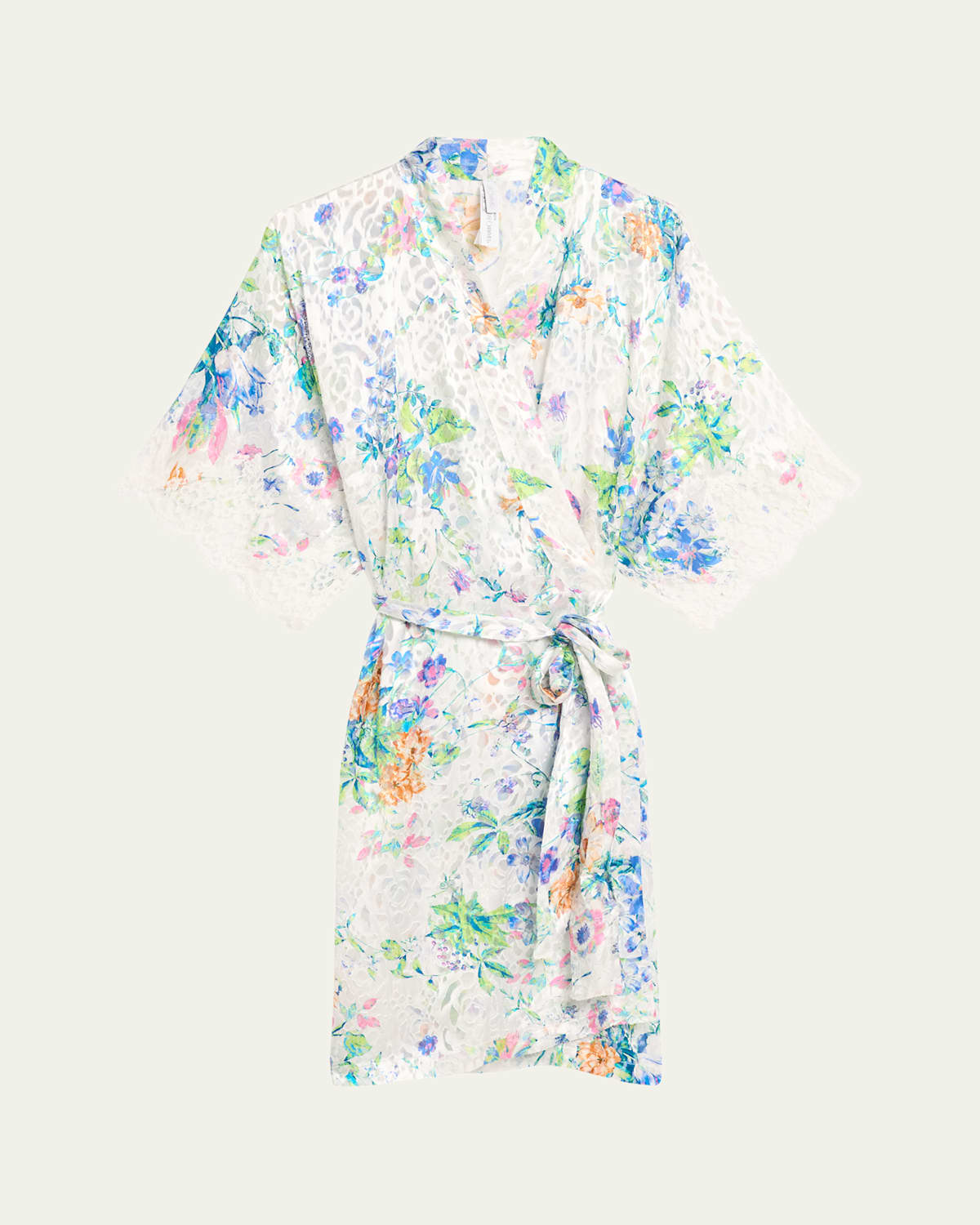 Lise Charmel "Baisers Legers" floralprint robe with scalloped lace trim Surplice neckline; wrap front 3/4 sleeves Waist selftie Hem hits around the knee Straight silhouette Viscose/nylon/polyamide Made in Bulgaria