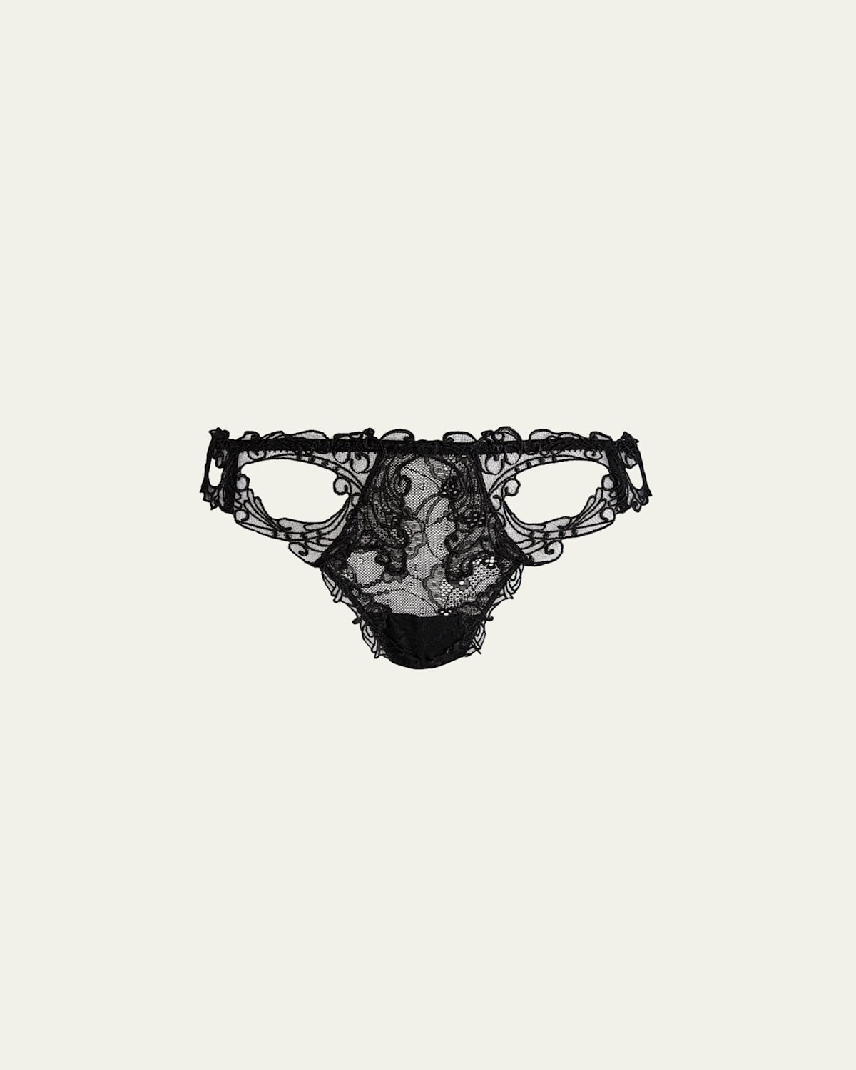 Lise Charmel "Soir de Venise" openwork lace thong with tulle back and a charmembellished back cutout Low rise sits across hips Bow at the center back waistband Scalloped leg openings Minimal seat coverage Lined gusset Nylon/polyester/cotton/spandex Imported