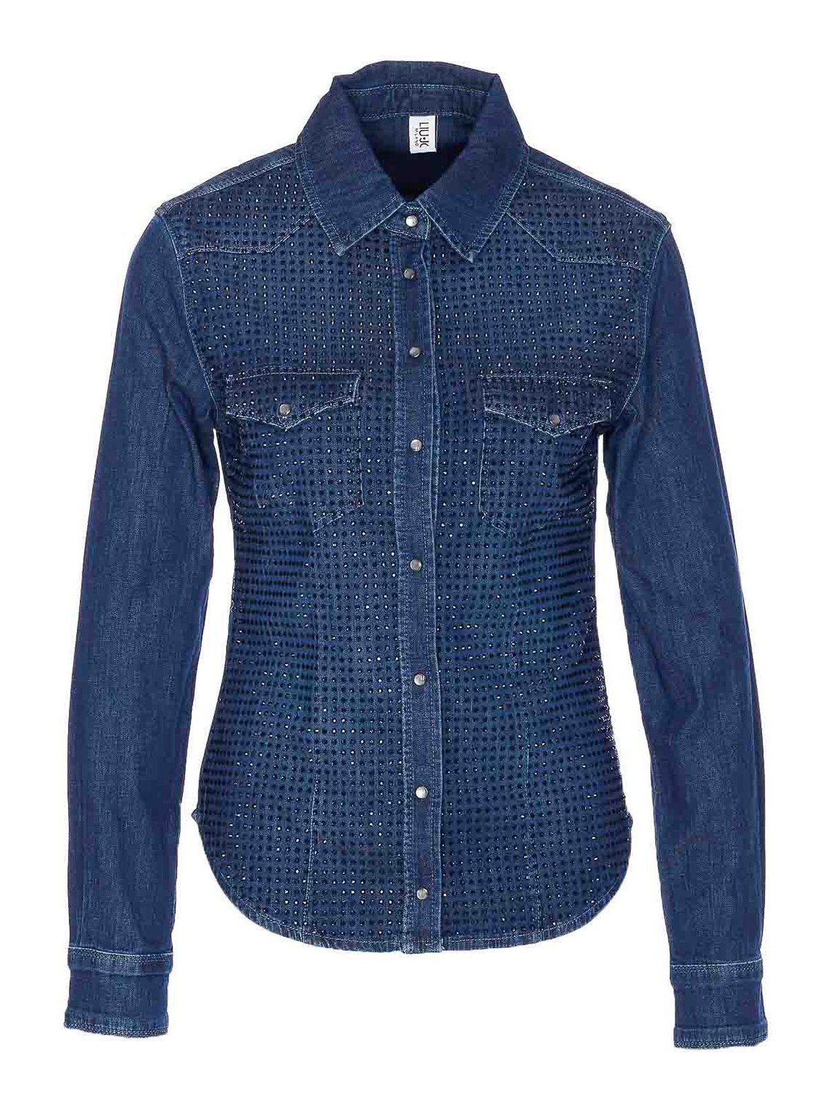 Chemise en jean bleu Liu Jo, fermeture à boutons-pression, poches frontales, cristaux sur toute la surface
