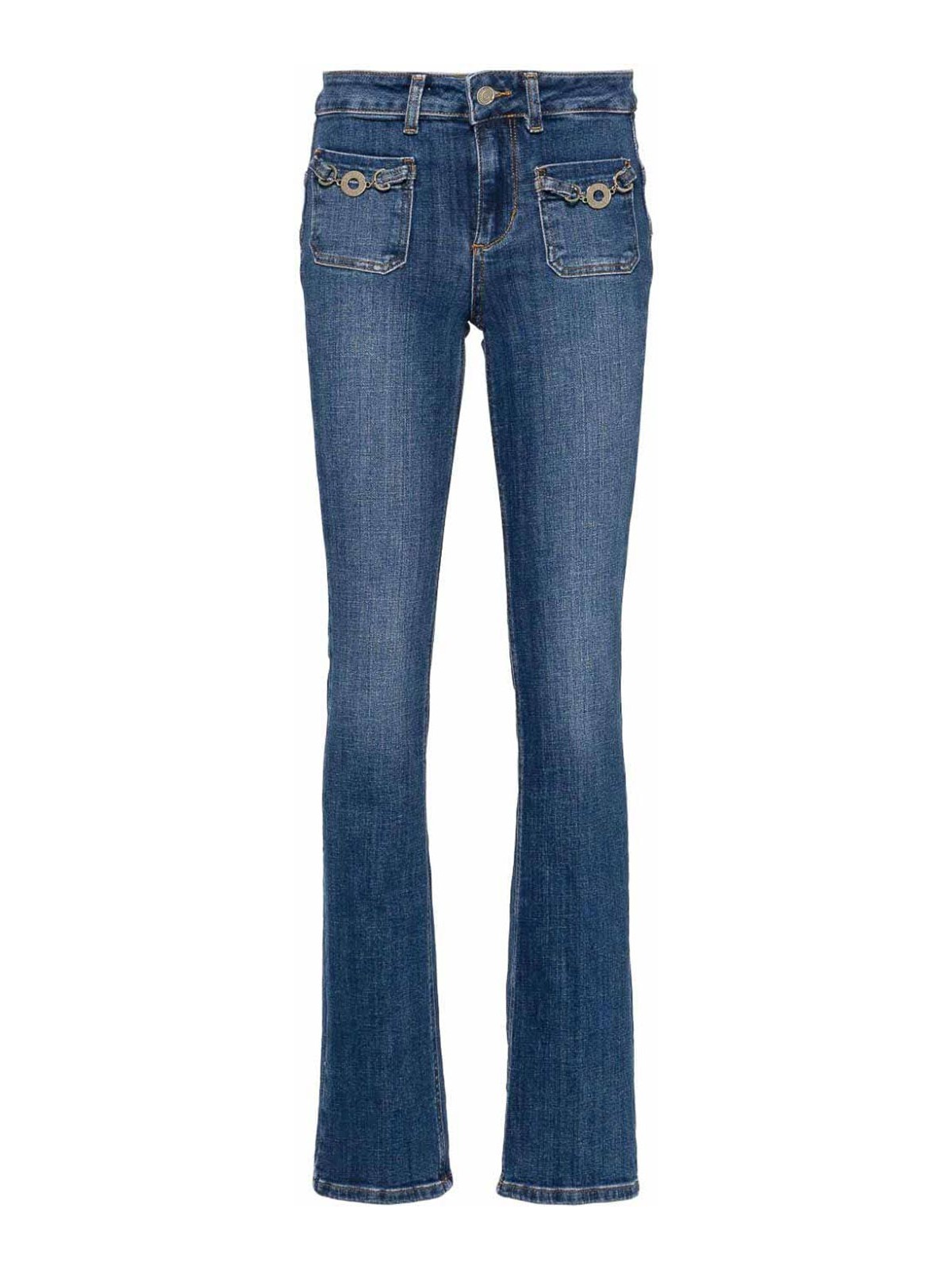 Braguette boutonnée en jean stretch délavé bleu indigo, passants de ceinture, breloque à logo, deux poches plaquées, plaque siglée, deux poches arrière plaquées, coupe bottée