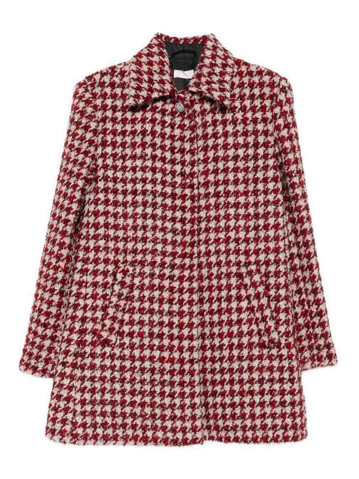 Motif pied-de-poule beige, boutons et revers crantés, poches latérales plaquées, manches longues