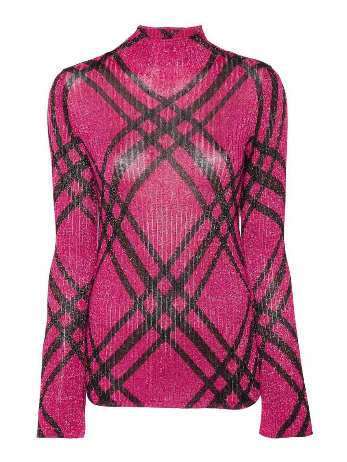 Motif à carreaux rose vif, col haut, manches longues et ourlet côtelé