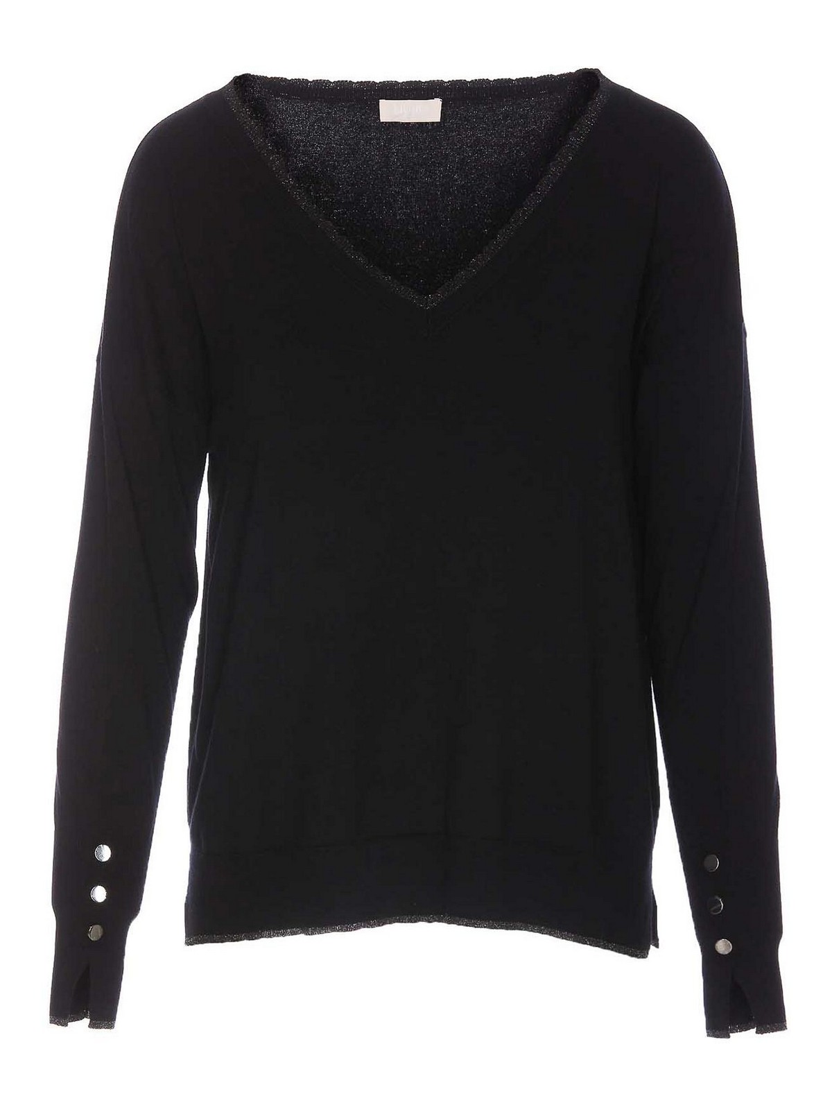 Pull noir Liu Jo à col en V, manches longues, boutons sur les poignets