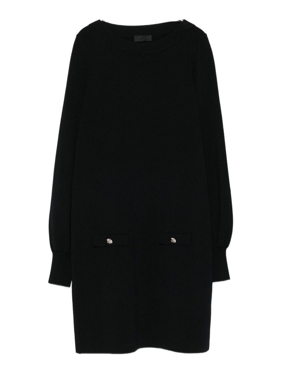 Black boat neckline long sleeves with balloon decoration with buttons applied pockets