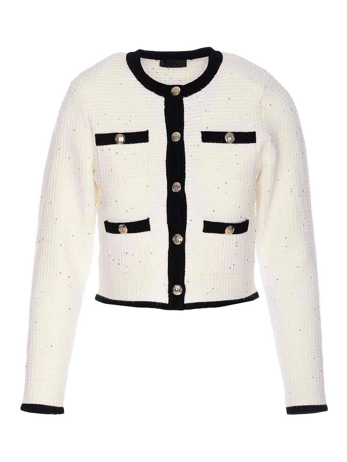 Veste « boucle » blanche Liu Jo, col rond, manches longues, boutons sur l'ensemble, sequins, épaules renforcées, nom du créateur: blanc