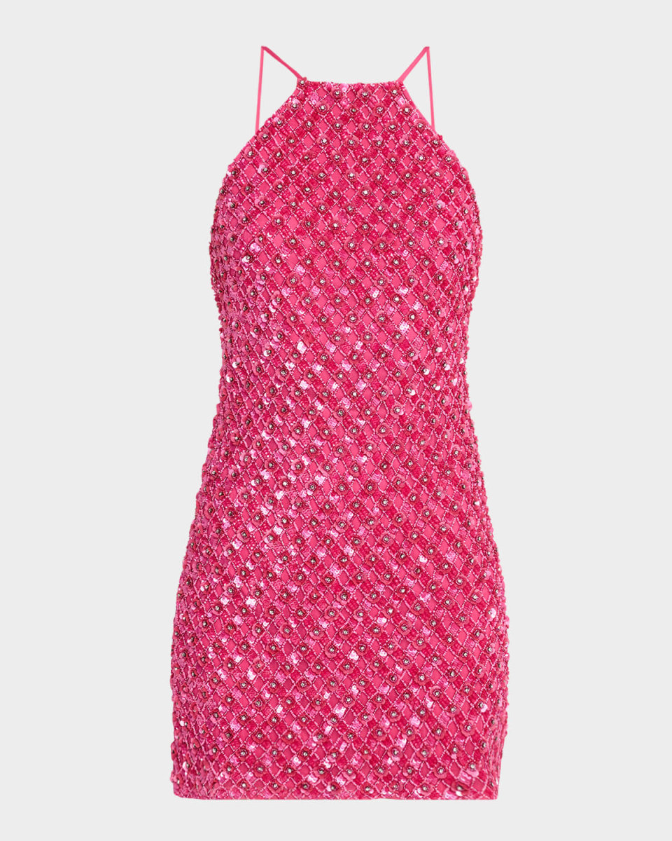 Liv Foster "Violet" mini dress with beading, sequins, and crystals Approx. 35"L from shoulders to hem Halter neckline Sleeveless Adjustable straps Lowcut back Hem falls above the knee Bodycon silhouette Invisible back zipper Polyester Lining: Polyester Spot clean Imported